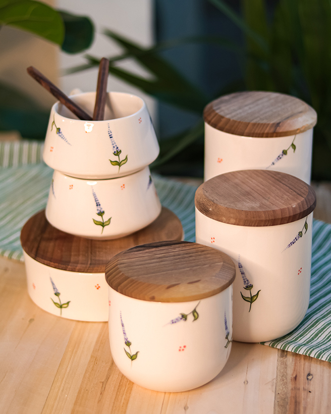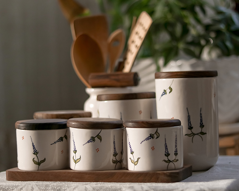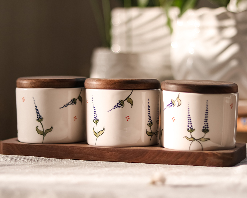 بانکه لاوندر در سه ابعاد 16، 13، 9 سانتی متر قطر دهانه بانکه ها همه 10 سانتی متر میباشد . بانکه کوچک جا ادویه ای ارتفاع 8 سانتی متر قطر دهانه 7 سانتی متر میباشد . چوب کار ها از جنس گردو میباشد .
